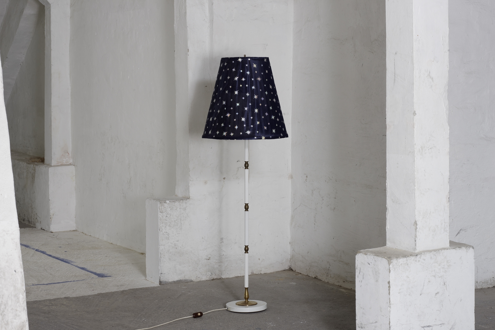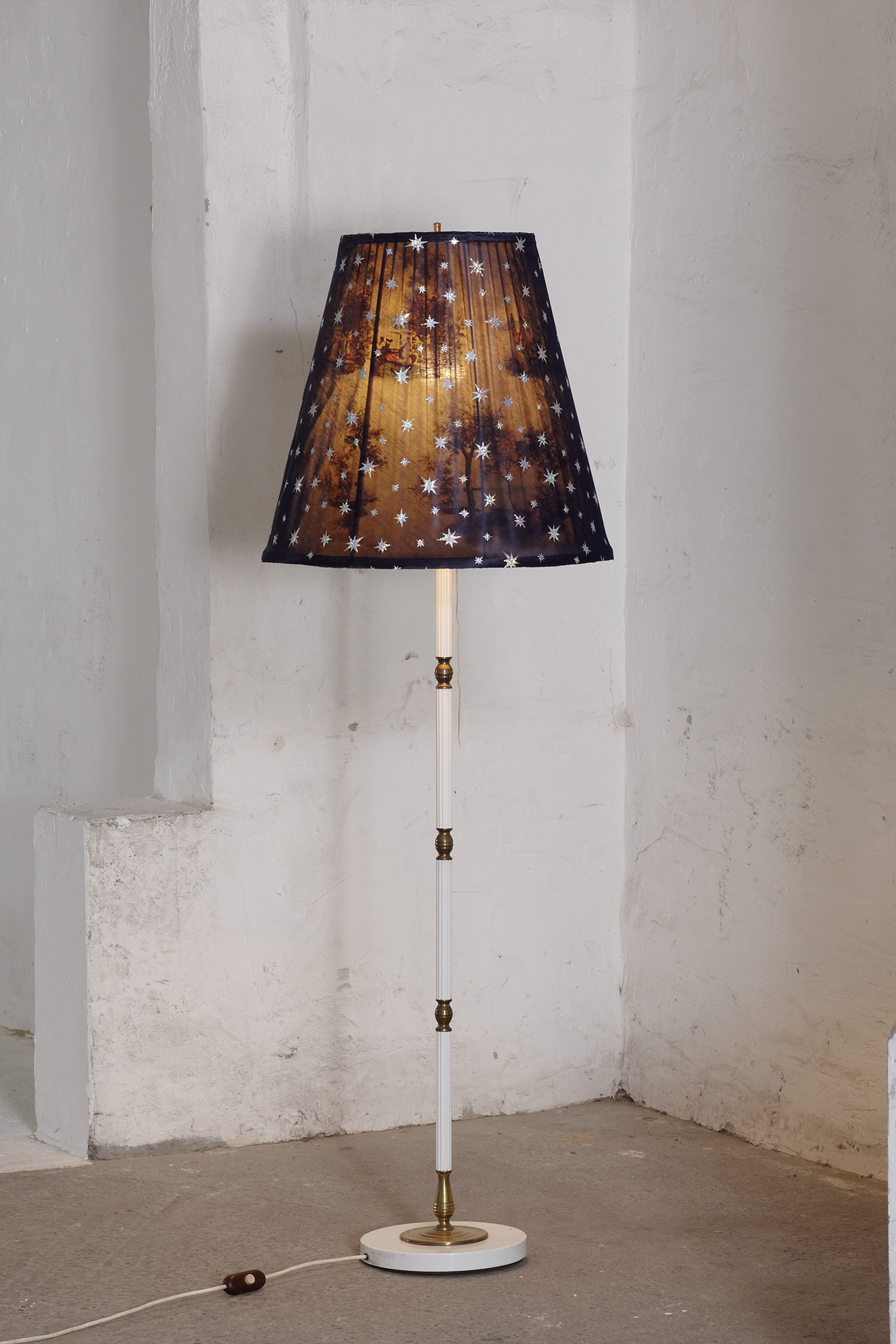 Material: Drahtgestell, verschiedene Stoffe, Holz-/Messingständer