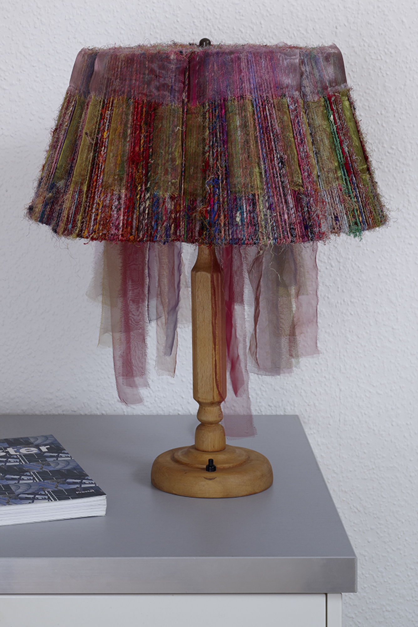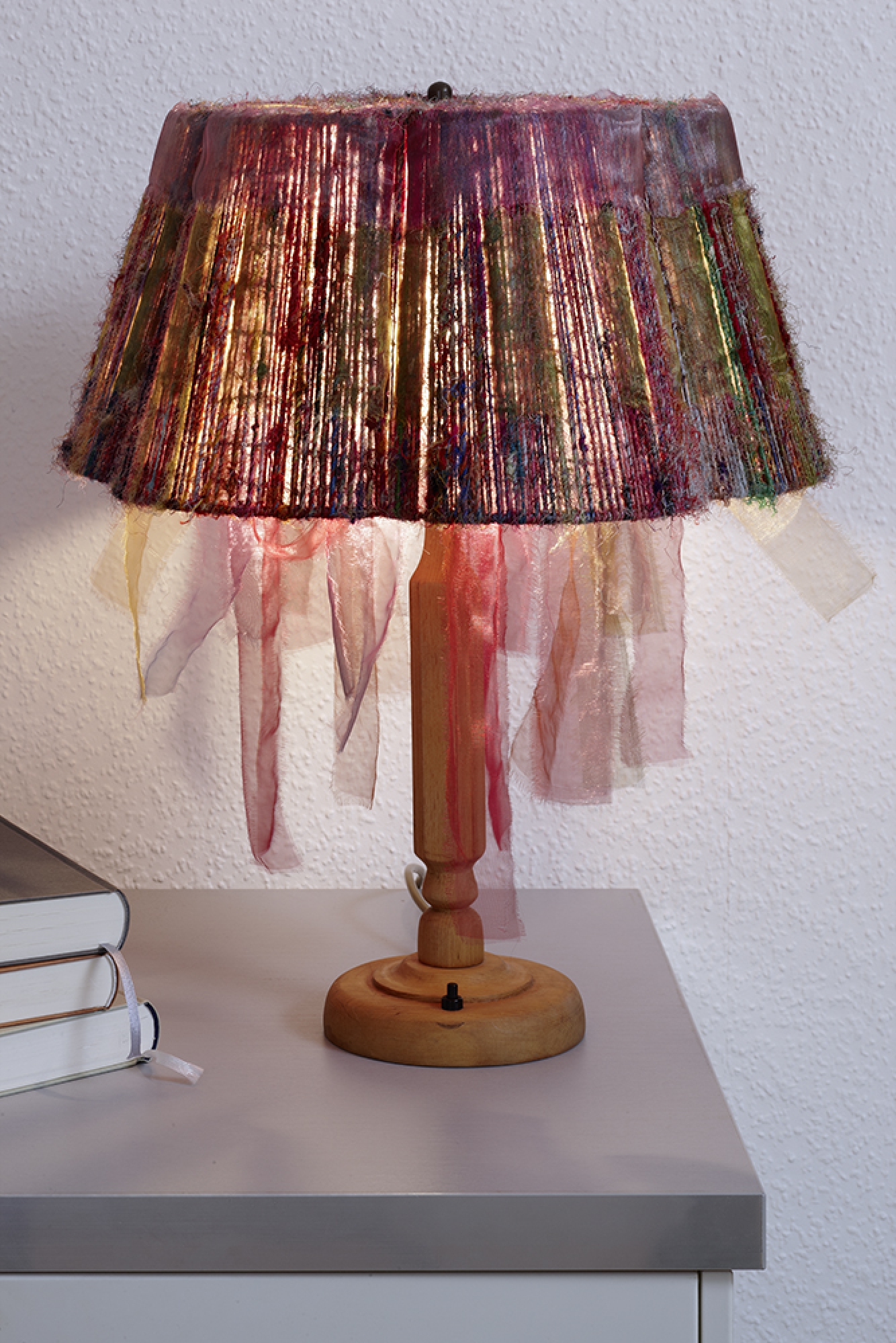 Material: Drahtgestell, Seide, Papier, Wachsmalkreide, Organza, Holzfuß