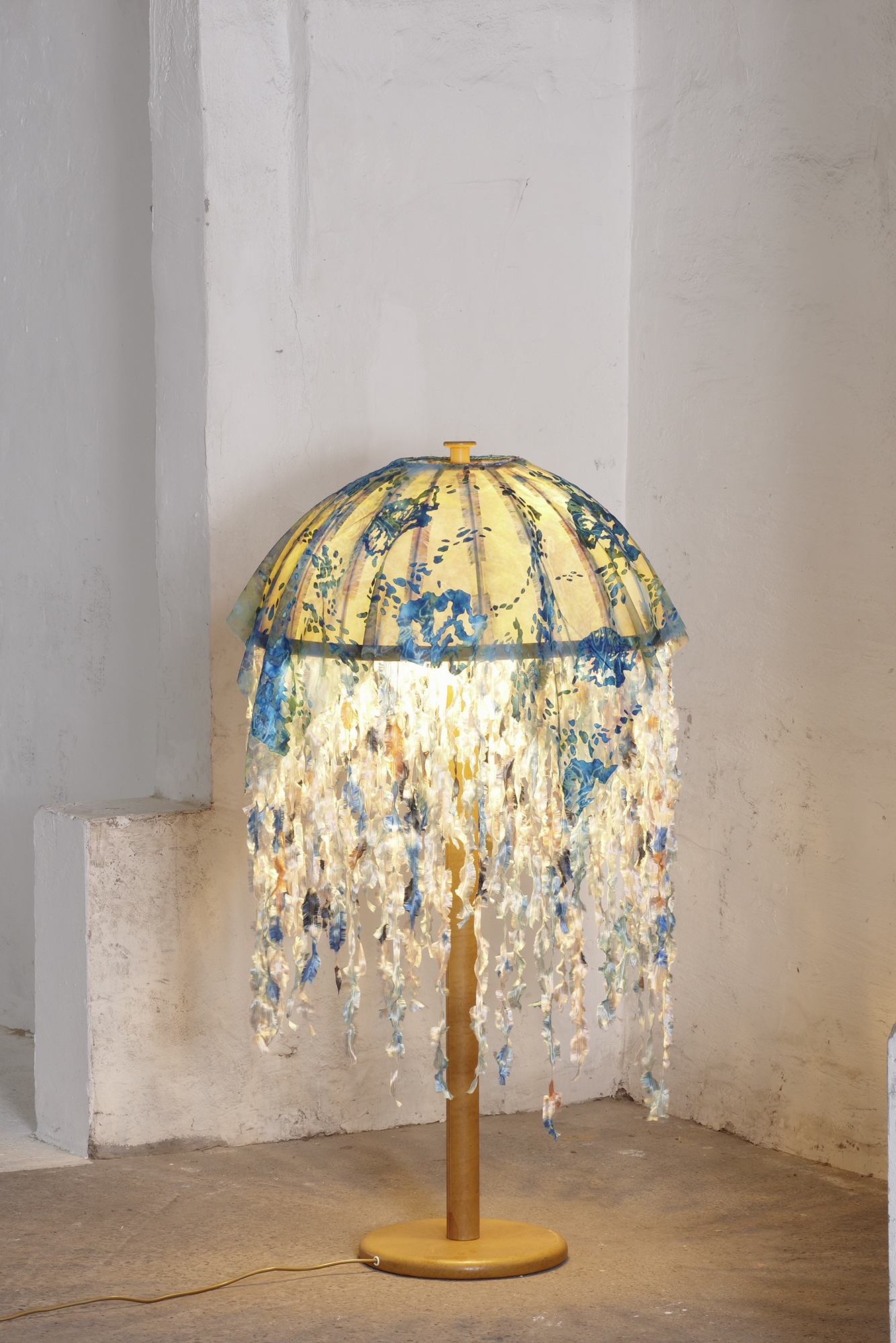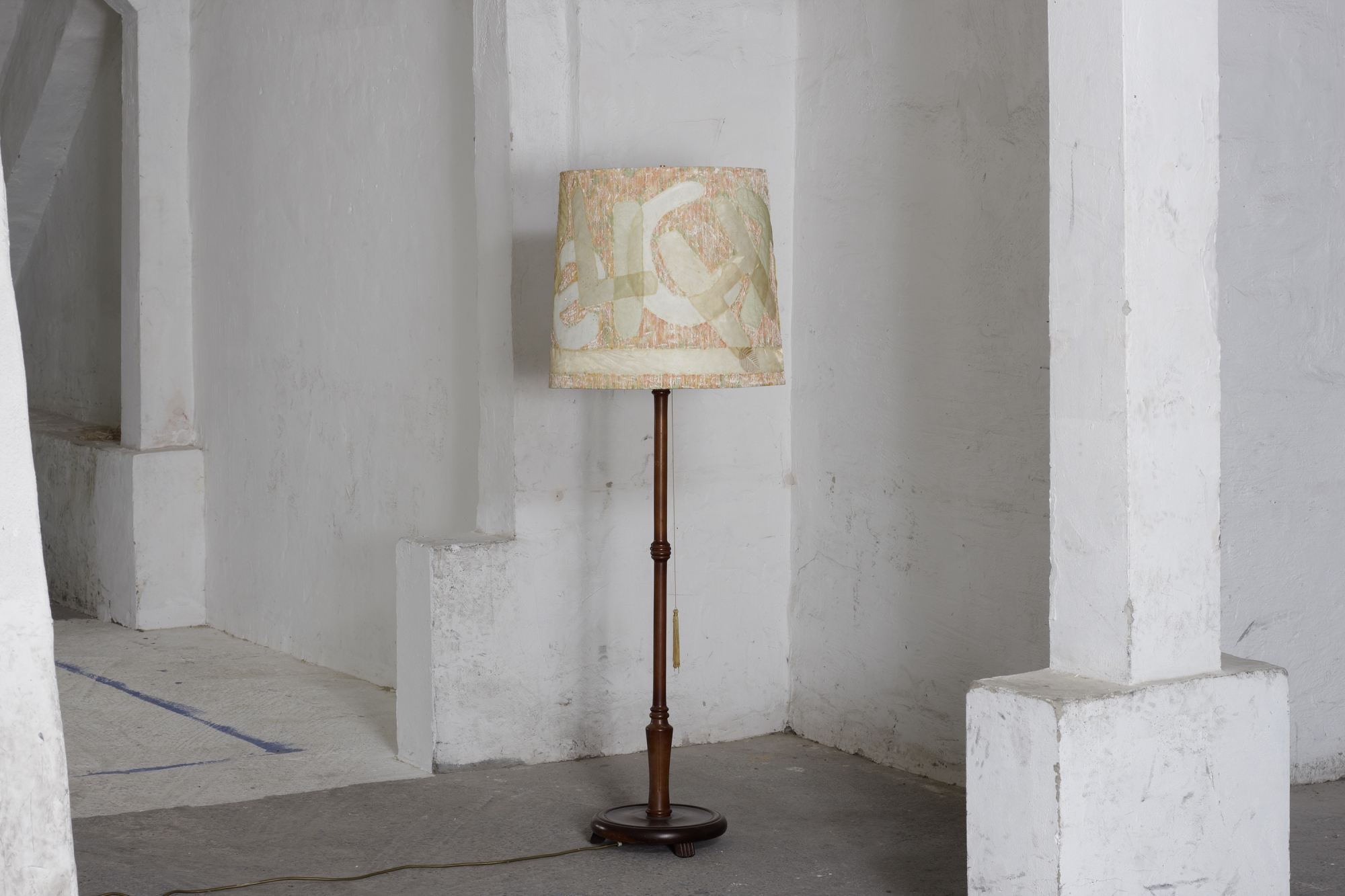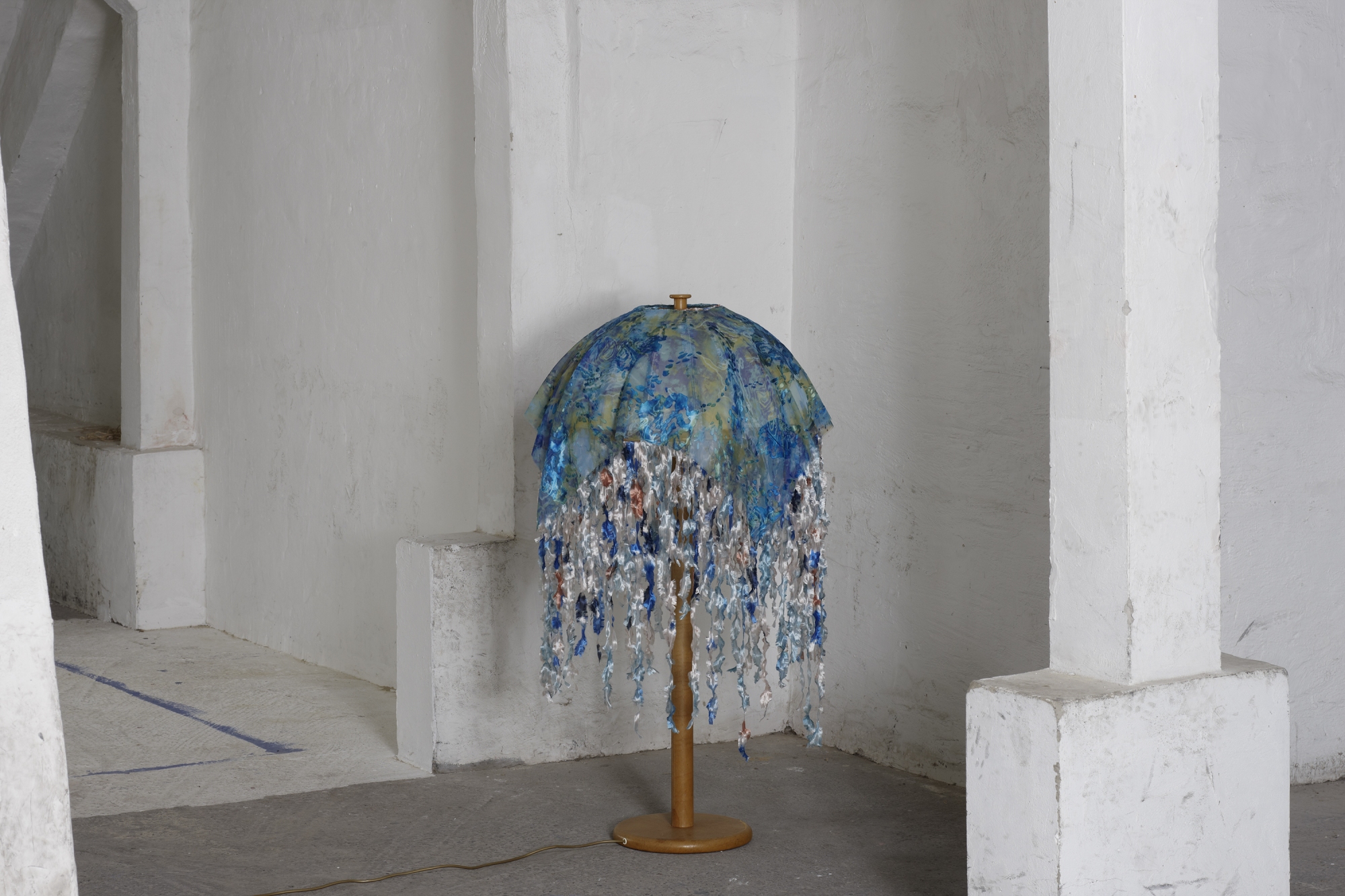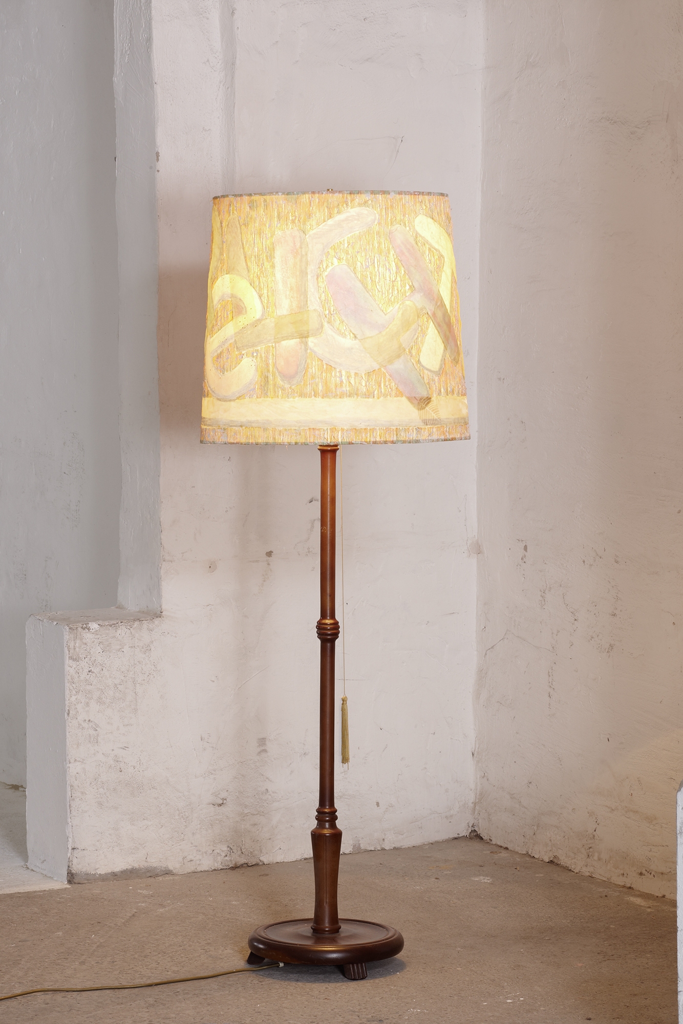 Material: Stoffbezogener Hartfolien-Lampenschirm, Plakafarbe, Wasserfarbe, Fasermalfarbe, Bleistift, Organza, Holzständer